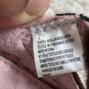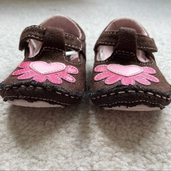 Genuine baby by O’shKosh baby girl shoes in size 3 brown with pink heart, in excellent condition. Has anti -slip rubber in the shape of flowers but these shoes are soft soles with ankle strap. Synthetic materials, man made, pink stitching around shoes.