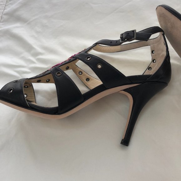 Authentic Jimmy Choo Black/Pink/Yellow Gold Soft Leather - Size 38.5 Great Condition. Heel height is 3.5 inches.
