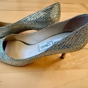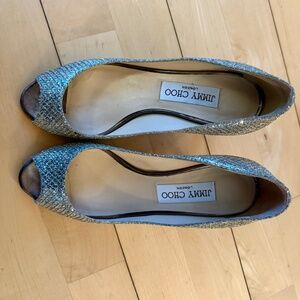 Authentic Jimmy Choo Isabel Slip-On Glitter Sparkle Kitten Heel Open Peep Toe Pumps in Champagne Silver