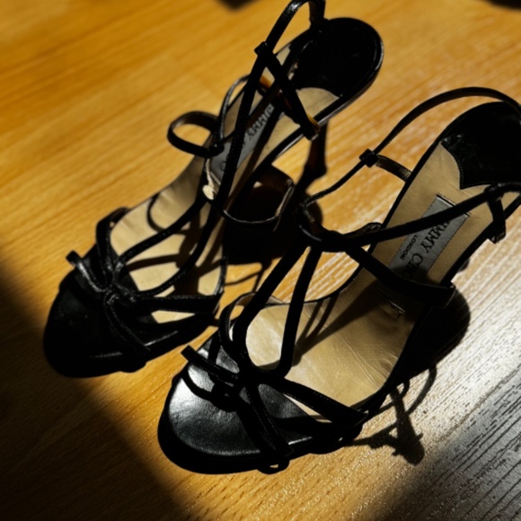 Step into timeless elegance with these authentic Jimmy Choo London strappy black heels. Crafted in Italy from genuine Vero Cuoio leather, they feature a sleek open-toe design with delicate straps that wrap gracefully around the foot and ankle.