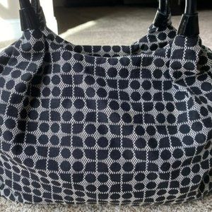 Beautiful black and ivory monogram canvas Kate Spade New York Classic Noel Stevie bag with gold-tone hardware, dual detachable flat grosgrain top handles, dual rolled shoulder straps, black patent leather trim, and dual exterior slip pockets featuring drawstring expansions at side gussets.