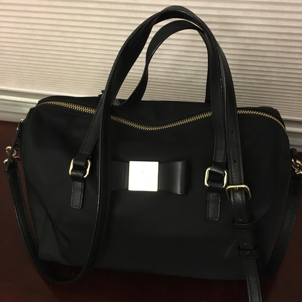 Gently used bag. Clean inside and out. No odors other than spearmint gum scent inside bag (lol) . Bottom of bag shows some odd lines due to wear (see pic) but no scuffs around the corners at all . Very stylish bag with the two handles and long adjustable strap that can be removed. Bag is nylon material. Bag dimensions: 28 inches L x 12.5inches W x 20 inches H