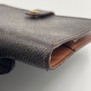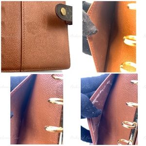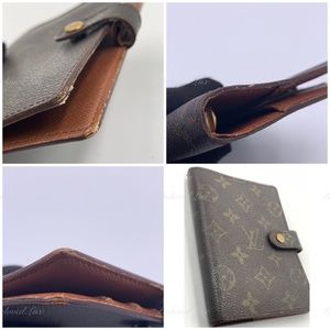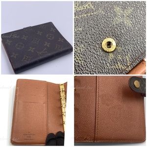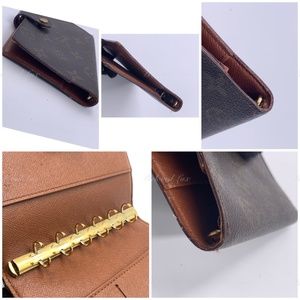 This is pre-owned condition agenda cover is crafted of Louis Vuitton signature monogram canvas. This opens to a brown leather interior with card slots, patch pockets and gold rings for inserts.