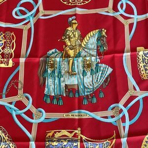 Renowned artist Christiane Vauzelles designed "Les Muserolles" in 1986 as an addition to Hermès ' vast catalog of fine scarves celebrating the Equestrian Arts. "Les Muserolles" refers to nose-bands (including bits) worn by horses. This scarf depicts an impressive knight in full armor astride a magnificent steed in the center. The horse's armor and regalia, including the wrought nose-bands, are equally awe inspiring! Warm earth tone shades of chocolate, sand and gold perfectly complement each other and promise many years of wear. Made in France.