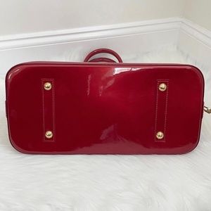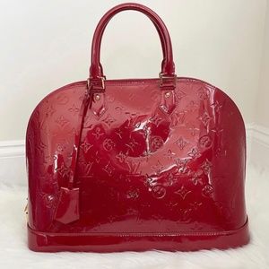 Louis Vuitton alma GM in gorgeous red color pomme d’amour. Slightly used, very clean and in amazing condition. Comes with dust bag and Louis Vuitton box. On the tag initial K.L is written but you can simply remove the tag or wear it the other way. Original L.V lock. Slight wear on the bottom (see photos) CONDITION: Very good. Light wear along corners, faint residue and faint scuffs on patent surface, light peeling at end of key hook of clochette, light scuffs on hardware, faint marking on interior lining.
