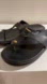 Chic black sandals by Louis Vuitton. These preowned Louis Vuitton sandals are a casual, yet comfortable pair to sport on your next beach vacation. Crafted in Italy, these open-toe designer sandals showcase a black epi leather t-strap adorned with a small logo-debossed circular stud, and a gold-tone hardware buckle detail at the center. A chunky rubber sole offers a bit height and the grooved soles guarantee some traction. The interior is lined in a smooth tonal leather for added comfort. For a glamorous resort ensemble, pair these authentic Louis Vuitton Epi Sandals with a white flowy midi dress and a simple luxury crossbody.