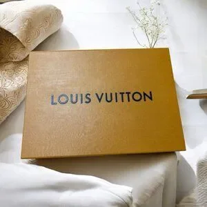 Authentic Louis Vuitton orange box with the iconic navy logo, perfect for stylish storage or display.