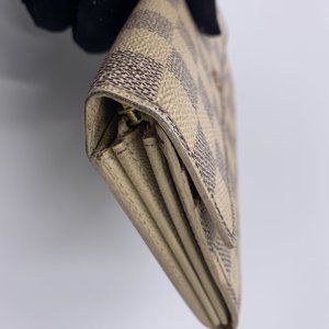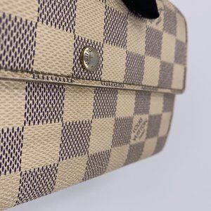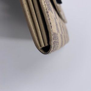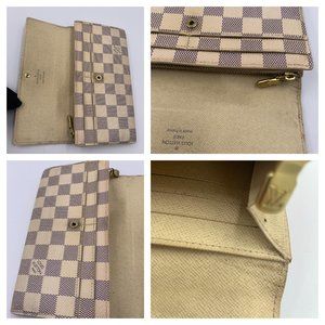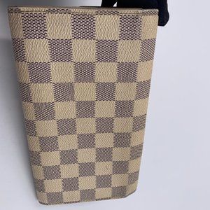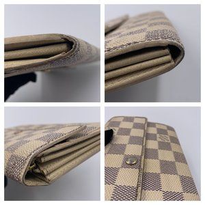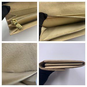 Authentic Louis Vuitton Damier Azur White Long Wallet. W 7.5” X H 4.25”. No dust bag, no box. Outside: Hardware with scratches and some area of gold hardware turning silverish color. Overall the exterior with rubs/scratches/stains/darkening on canvas from previous used. See photos for part of the white canvas turned to yellowish color. No cracks on canvas. Inside: darkening/stains/rubs/scratches/dry leather inside. See photos for additional details. Odor: perfume smell. NOT ACCEPT OFFERS.
