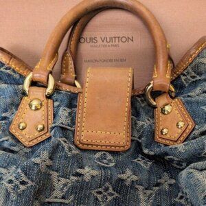 This is an authentic LOUIS VUITTON Monogram Denim Pleaty in Blue. This is a stylish bag that is crafted of Louis Vuitton monogram treated pleated discolored light denim. It features rolled darkened vachetta cowhide top handles with polished brass rivets to secure the leather anchors, a worn aged leather top crest lining and a cross-over strap and a brass press-lock. This opens to a yellow saffron microfiber interior with a patched pocket.