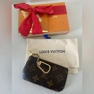 Chic Louis Vuitton key pouch. Iconic monogram pattern. Gold-tone clasp adds elegance.