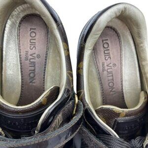 LV lace up monogram canvas sneakers with brown metallic patent leather accents, rubber sole, velcro strap and lace up closures at top