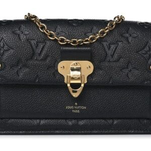 The Vavin Wallet on Chain is fashioned from Monogram Empreinte leather and finished with a gold-color lock inspired by Louis Vuitton trunks. This model in leather’s subtle tone-on-tone embossed print complements the wallet on chain classic lines perfectly. The front pocket, embossed with the Louis Vuitton signature, fits a phone, while inside pockets and compartments bring convenience.