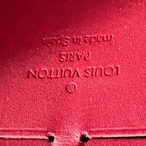 The Louis Vuitton Vernis Zippy Wallet M91981 is a long, zip-around wallet crafted from glossy Monogram Vernis patent leather in a vibrant red color, sometimes described as "Pomme d'Amour". This iconic and highly functional accessory is a popular style from Louis Vuitton, known for its practical, well-organized interior and secure zip closure.