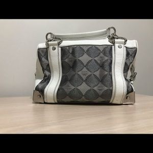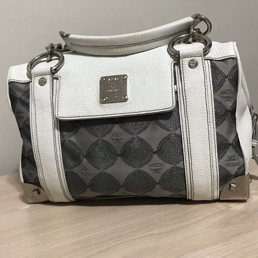 Preloved, white/grayish metallic prints with silver tone hardwares engraved with MCM logo.