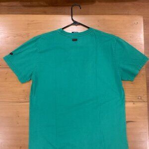 The only damage is one small pinhole on the left arm shown in the fifth photo. Please note that in the fifth photo, the colour of the shirt looks blue, but that is due to the lighting, and the shirt's colour is really green as seen in the other photos.