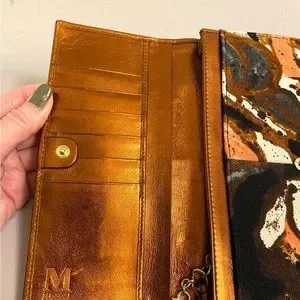 100% authentic M by Missoni long wallet. The fabric on the outer part is very nice color combination, inside is more copper color. It was sitting in the closet for very long, hardly been used, corners are all good, inside still very clean.