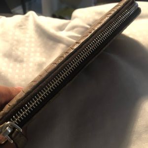 zipper is smooth, normal use. no tear, many car compartments. nice long wallet. color is brown. no inclusion