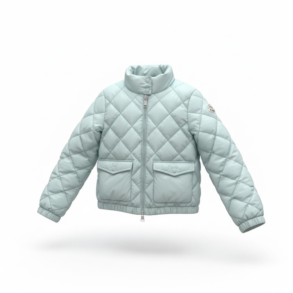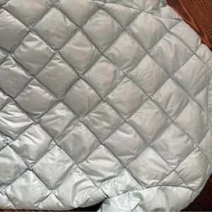 Stylish quilted jacket in light blue. Features a cozy design with front pockets.