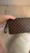 Stylish checkered brown wristlet pouch with gold accents. Perfect for carrying essentials.