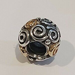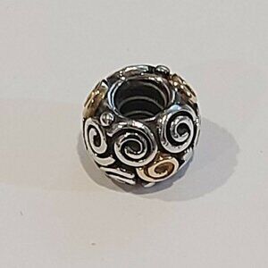 The Pandora Sterling Silver and 14kt Gold Swirl Charm 790414 is a whirling floral delight. Crafted from sterling silver and 14kt gold this beautiful bead of abstract roses is a sight for sore eyes. The perfect blossoming and flowery addition to your charm collection. Not too many of these left. Get yours today!