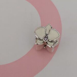 New, Inspired by one of nature's most beautiful flowers, this sterling silver charm encapsulates its grace in a delicate design embellished with hand-applied white enamel and shimmering stones. Ideal for adding a tropical twist or creating eclectic floral mixes