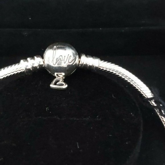 (An extra touch of love is added to the classic Pandora Moments Bracelet with a new clasp design. The word ‘love’ is written across the smooth spherical clasp and a tiny heart hangs below. Two clip stations are positioned on the silver snake chain.)