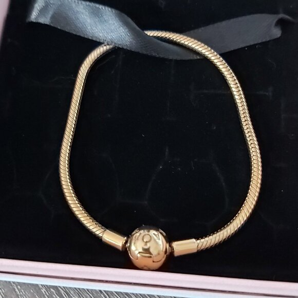 Item Type: Bracelets. A charm bracelet in 18k gold-plated sterling silver with the Pandora signature logo ball clasp.