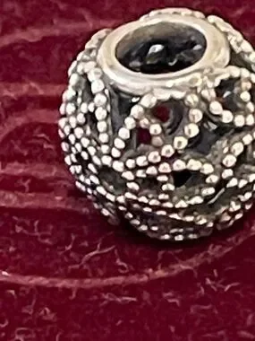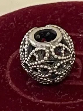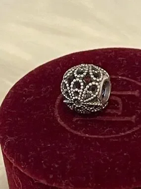 Pandora Retired— Elegant sterling silver filigree bead open work rose charm with intricate openwork detailing. Adds timeless style to bracelets and necklaces. Lightweight and versatile for everyday wear. Silver finish complements any jewelry collection. And in excellent used condition.