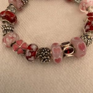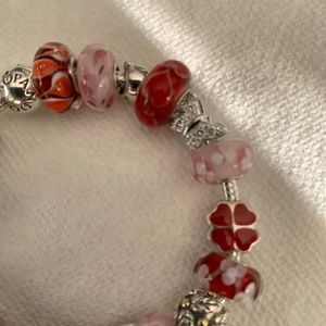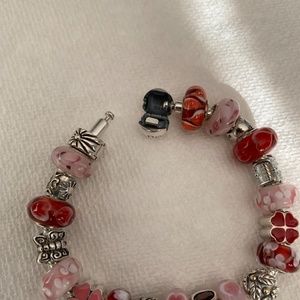 This is a brand new Authentic Pandora 19 cm ( 7.5 inch ) sterling silver bracelet purchased in an original Pandora store , with 21 genuine single core sterling silver charm , which is glass beads , hand painted glass beads , enamels , sterling silver beads and 1 stopper beads . Each of the charm beads stamped with .925 a symbol of the silver . I put them together to make it a nice lovely bracelet so I purchased the beads from all different jewelry stores . This is never was used brand new . Comes in the original Pandora box .