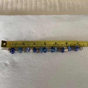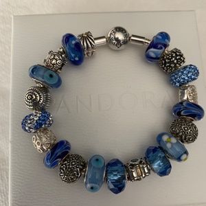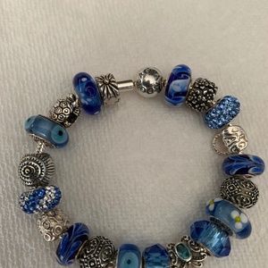 This is a brand new Authentic Pandora sterling silver 19 cm ( 7.5 inches ) bracelet , the chain purchased in the original Pandora store . The charm beads are genuine sterling silver beads stamped with .925 a symbol of the silver , every single all of them , purchased in the different jewelry stores . The charm beads are glass beads , faceted beads , sterling silver and antique sterling silver beads and one stopper beads . The bracelet has 20 charm beads all together . Comes in the original Pandora box .