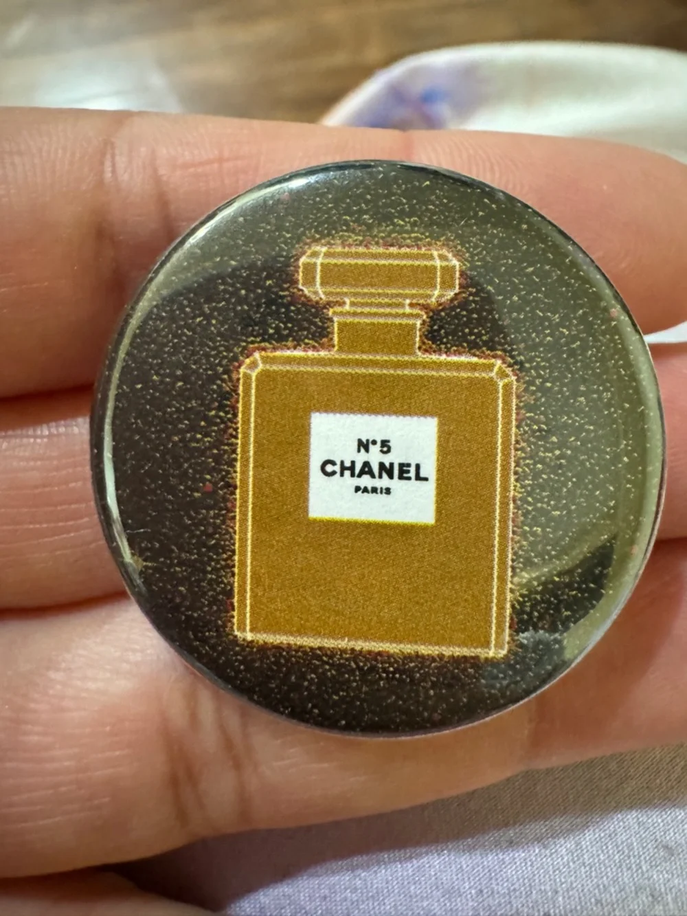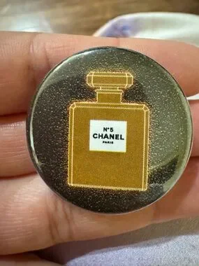 Round pin featuring a stylized gold perfume bottle graphic. Glossy surface with fine glitter accents. Easy to attach to jackets, bags, or hats for a designer touch.