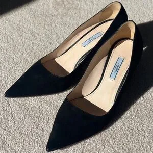 Chic black heels with a sleek pointed toe. Perfect for elevating any outfit. Crafted by Prada for style and comfort.