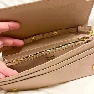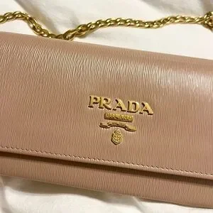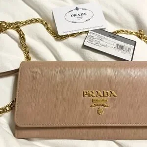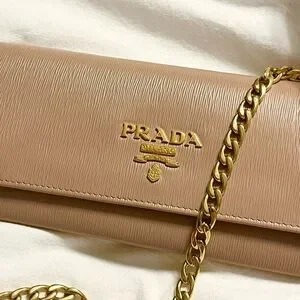 Chic Prada clutch in tan-nude leather. Features a striking gold chain. Ideal for stylish outings. Strap can be removed and the bag can also be carried as a clutch.