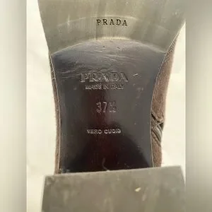 100% authentic Prada suede dark brown boots, size 37.5 as Prada size, made in Italy. The front and back has some patterns on it, very chic.