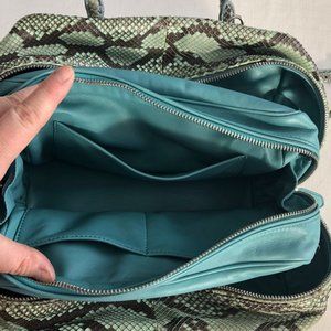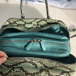 Authentic Rare/Exclusive Prada handbag bowling bag with Front Logo, Divider Inner Pocket , Adjustable Shoulder , Removable Shoulder. Python leather teal, silver brown colour. and teal inside.