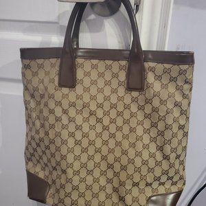 Fantastic vintage Gucci with classic monogram pattern. Oversized bag holds all your stuff! Use it as a day to day purse, diaper or travel bag. I've never seen this style before and searched for a while but have never found another like it. Some scratches and scuffing on the leather but in overall great condition. Fabric and interior in excellent condition. Hurry, won't last long!