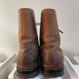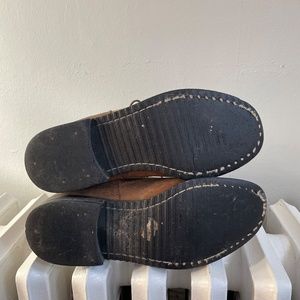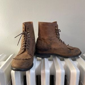 Thick tan leather authentic riding boots - used for streetwear only. Justin or Laredo style with the fringe on the toe. Beautiful patina.