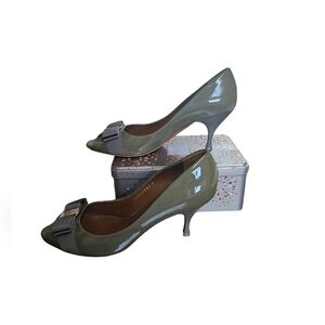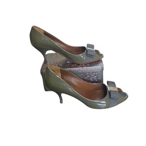 Authentic Salvator Ferragamo Polo Peep Toe bow heels olive color silver bucle.