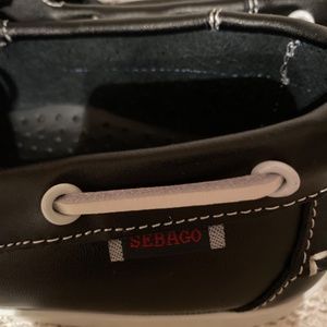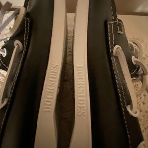 Authentic Sebago Dockside’s shoes in black leather and off white trim. NWOT in excellent condition, never worn. No marks or scuffs. Made in USA. Size 10.