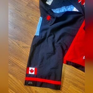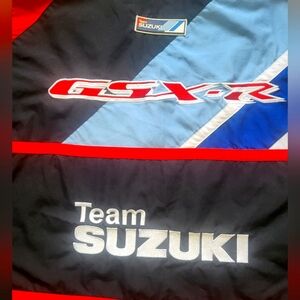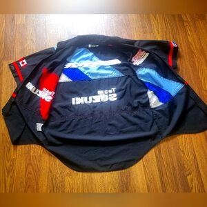 Features bold embroidered GSX-R and Team Suzuki logos on both front and back, with vibrant red, black, and blue racing stripes. Sleeve patches include the Canadian flag and European racing patch. This shirt is a rare piece of vintage motorsport history — perfect for collectors or motorcycle enthusiasts.