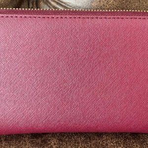 Beautiful maroon saffiano leather with gold tone hardware. Comes with detachable leather wristlet strap. Some minor tarnishing on hardware (refer to photos). Inside of wallet is clean. No rips, stains, tears, odor. Credit card slots are firm and not loose nor sagging.