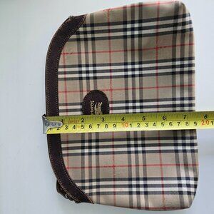 Authentic Burberry pouch, vintage from back when the brand was named Burberrys. Sourced from Japan. Good for vintage condition bit most definitely has wear. A little wear to the trim and the pull piece of the zip is split, but the zip is good and works smoothly. Minor wear to bottom corners. Measurements shown in pictures, but good sized, fits more than a phone