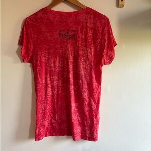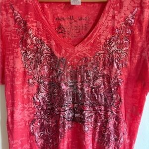 Bold and fiery, this vintage Harley-Davidson T-shirt is a true Y2K gem. Featuring a vivid burnout red pattern, a deep V-neckline, and an ornate black glitter Harley graphic with rhinestone details, it’s got just the right mix of biker energy and femme edge. The back is stamped with “Green Mountain Harley-Davidson, Essex Junction, VT” – a collectible touch.