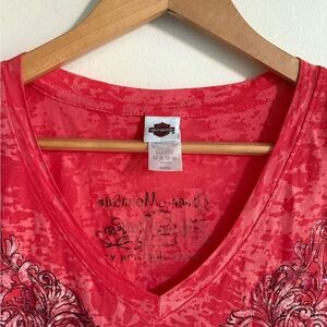 Bold and fiery, this vintage Harley-Davidson T-shirt is a true Y2K gem. Featuring a vivid burnout red pattern, a deep V-neckline, and an ornate black glitter Harley graphic with rhinestone details, it’s got just the right mix of biker energy and femme edge. The back is stamped with “Green Mountain Harley-Davidson, Essex Junction, VT” – a collectible touch.