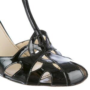 Authentic black Yves Saint Laurent patent leather T-strap pumps with covered heels, peep toes and gold-tone buckle closures at ankle straps.
