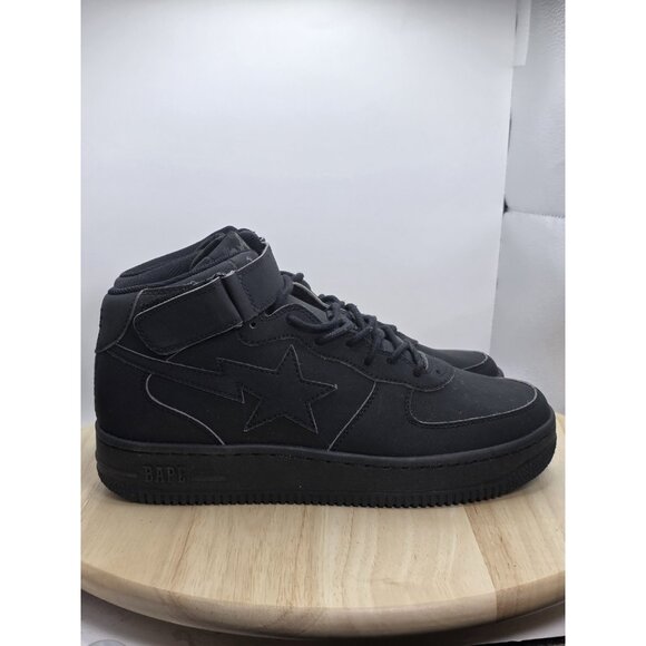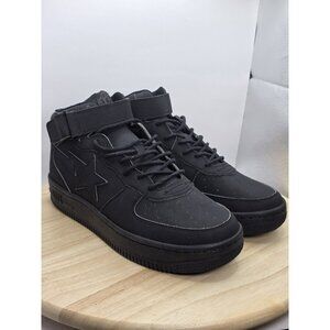 The product is a pair of Authentic a Bathing Ape BAPE STA Foot Soldier black suede men's shoes in size US 8. These sneakers feature a low-top shaft style with a lace-up closure, making them suitable for casual occasions. The shoes are signed by the brand A Bathing Ape and are part of their Bapesta product line. Made with leather and rubber outsole material, these sneakers are designed for athletic wear and are ideal for the seasons of summer, fall, and spring. These shoes are a stylish and unique addition to any man's wardrobe.