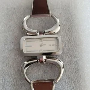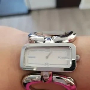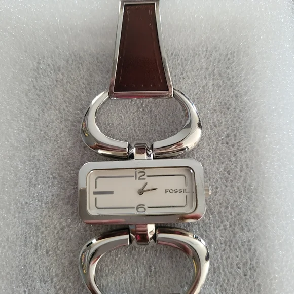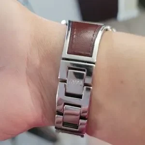this is my old watch of fossils with touch of brown leather on the bracelet,stainless Steel and battery operated.You can use this watch if your attending events and wearing dresses.thank you for inquiring and God Bless