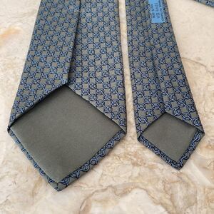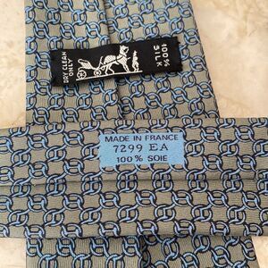 In excellent preowned condition authentic Heemes 100% silk tie featuring an all-over blue and gray chain pattern on a green base.