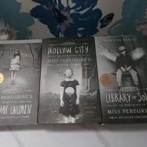 First three books in the Miss Peregrine's Home For Peculiar Children series. Book one is paperback, two and three are hardcover. Book two has a slight tear in the dust jacket. Book three is autographed by the author.