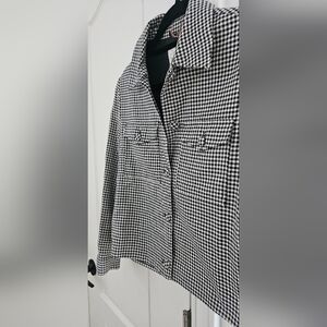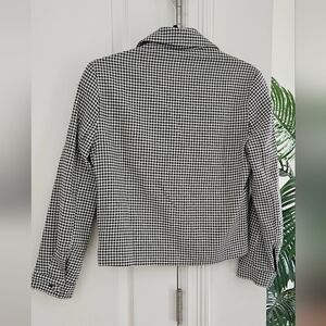 Stylish cropped blazer. Features classic black and white pattern. Ideal for versatile wear.